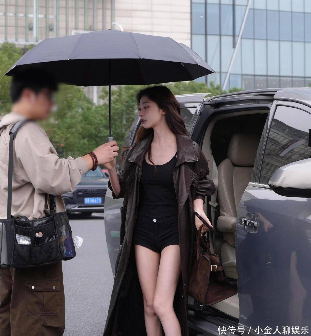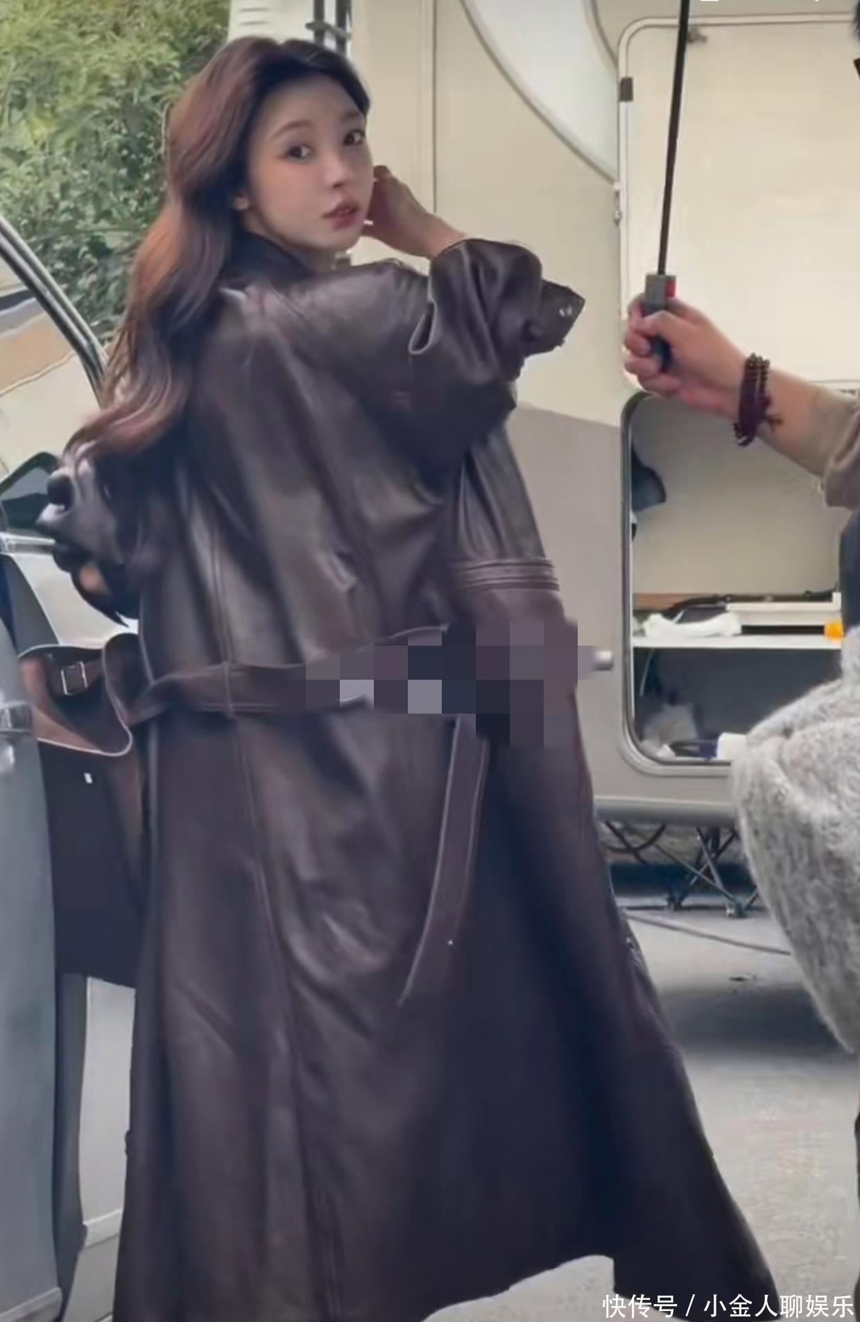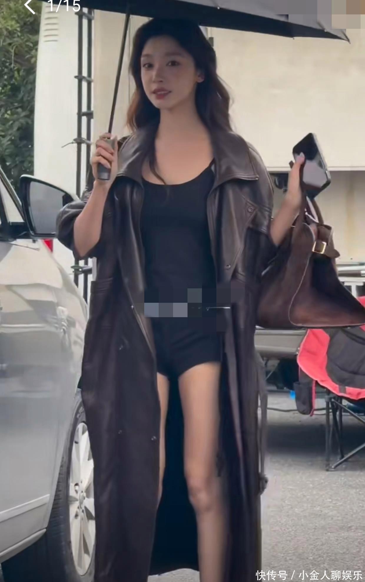 现在已经是正儿八经的冬天了,天寒地冻的那种,照片里的路人都穿得厚厚的毛衣或者羽绒服,唯独她一身牛皮大衣,里面只穿了件薄薄的打底衫和超短裤,超短裤也没搭配丝袜啥的。风一吹过去,也不知道会不会得个老寒腿啥的。
